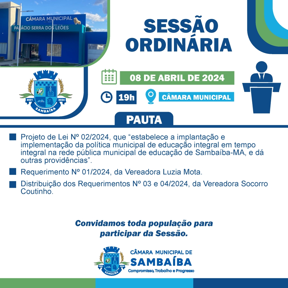 A Câmara de Vereadores de Sambaíba realizará Sessão Ordinária neste dia 08 de abril. A Sessão está prevista para iniciar às 19 horas, no prédio da Câmara Municipal.